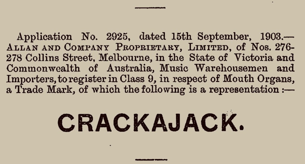 Where to next? Pat ventured to the world of Trademarks, a place he was familiar with. He uncovered a mine of information relating to Australian harmonicas, but nothing that helped us in our quest. He kept digging. He was nearly down under when he came across a Trademark for the ‘Crackamonic’. Alas there was no extra information and a default date had been given for its registration (Monday January 1, 1900). Ray was excited by the find as Nellie Collier had told Ray of a ‘Crackajack’ Chromatic, but he had never seen one. “I’m stoked! I was never able to see a ‘Crackajack’ Chromatic I couldn’t source one not even a photograph for my book. This shot of the ‘Crackamonic’ is a first for me” (A picture exists in John Whiteman’s’ anthology). These were on sale in Australia in 1938 but with the onset of war and because they couldn’t compete with the ‘Chromorgan’ by Alberts, they disappeared as quickly as they arrived.