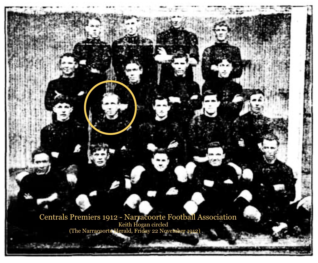 Keith left school for employment at the Caldwell’s newspaper as a compositor. These weren’t his only passions as he also exhibited exceptional talent on the park as an Australian Rules footballer. He even created his own team in 1907, the Warrior Football Club, who would compete in classic and brutal showdowns with the other local Naracoorte team. At their inaugural meeting of the Warrior Football Club Keith was duly elected captain of the team. In 1912 the Warrior Football Club was dissolved (they were back in 1914) and a three team Naracoorte Football Association was formed. Keith captained the Centrals to the first ever premiership and played a blinder. In the same year he packed his kit bag and headed to Border Town, the Narracoorte Herald reported, “….the club had lost the services of Keith Hogan, one of the founders of the club and one of the most brilliant footballers in the South-East.” (Tuesday, 16 April, 1912)