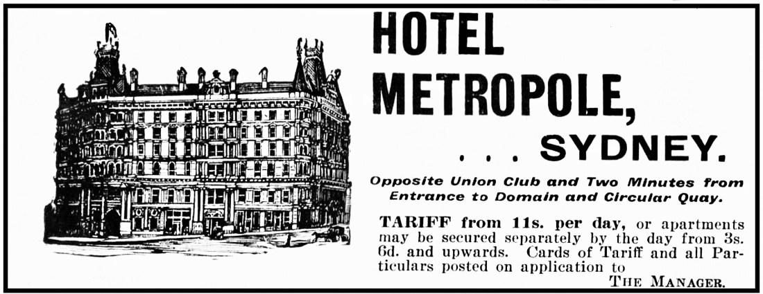 The Hotel Metropole was built by the Australian Coffee Palace Company for £150,000 in 1890. The grand building fronted Young, Bent and Phillip streets. You were greeted at the foyer with amazing stained glass windows and mosaic tiled floors. Fitted with electric lighting and lavish furnishings there were 260 guest rooms, several dining rooms and probably a gift shop selling ‘The Metropole’ mouth organs. The roof top promenade had exquisite panoramic views of Sydney town and the heads. Prominent International visitors who registered at the hotel included Rudyard Kipling and Jack London. Sadly in 1969 the hotel was closed and demolished.