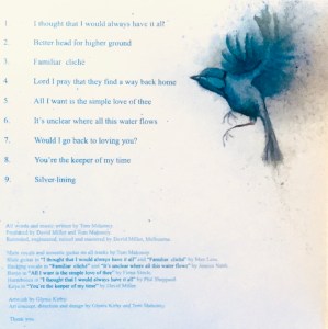 It kicks off with the catchy, countrified I Thought I Would Always Have It All that has floating slide guitar by Max Lees and heartfelt harmonica from yours truly. Every tunes a corker, however if I’m to nominate some other standouts I would include Familiar Cliche, It’s Unclear Where All This Water Flows (sweet harmonies by Jessica Nabb) and the final tune the upbeat Silver Lining.
