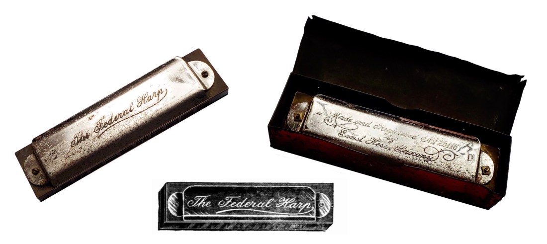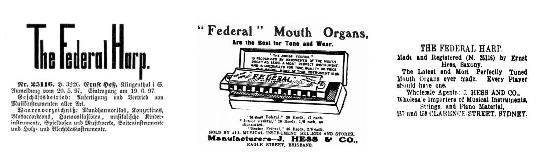 As promised a couple of advertisements from J Hess & Co. The Federal Harp was sold in Australia late in the 19th century from about 1898. It had been trademarked the previous year. The manufacturer Ernst Hess of Klingenthal Saxony had a display at the ‘World Fair’ held in Melbourne, Australia in 1880. J Hess more than likely had a family connection with Ernst. At some point in time The Federal Harp would become simply the Federal.