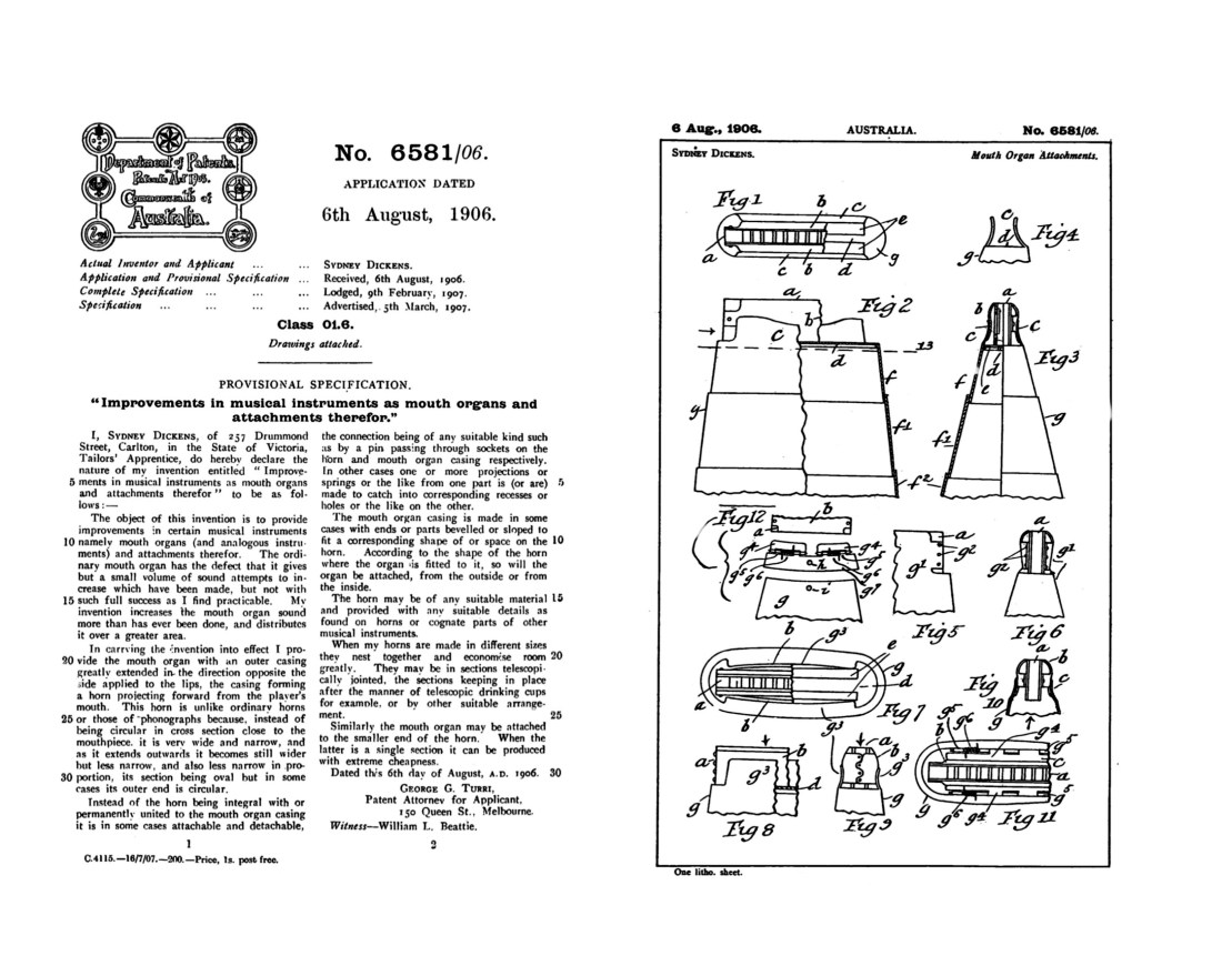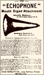 A ‘fair dinkum’ mouth organ amplifier acting like a megaphone, and enamelled in Australia’s colours of green and gold. It was available in two sizes, small (5 1/2 inches long with 6 inch bell) and large (17 inches long with 9 inch bell). All popular (probably those that weren’t popular as well) mouth organs could be attached increasing the volume six to eight fold-allegedly. This Sydney was born in 1884. His father was Simpson Dickens. In an article entitled Carlton Sensation from The Herald in Melbourne on 30th November 1905 his identity was revealed. I’ll reprint the full story below as it is quite an encounter. Thanks to Guru Pat (Missin) a Patent was revealed and is displayed here along with an advertisement of the Echophone reprinted from The Bulletin (Vol. 31 No. 1588 of 21st July, 1910). The address in the patent for the applicant is the same as in the report on the Carlton Sensation. This Sydney Dickens I would suggest is more than likely the one who would play regularly on radio stations and received an honourable mention in the Australian Mouth Organ Championship of 1925 (won by Percy Spouse). The only question left is, who was the Professor Dickens on the Empire Records cylinders? Sydney Dickens, Sydney George Devine (Clement May) or a third unidentified Dickens? What the Dickens? As I write, Ray has been investigating this conundrum and may have new revelations. Over to you Ray. A new book is in production.