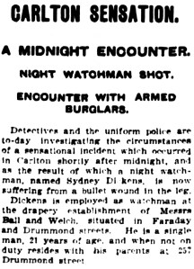 Detectives and the uniform police are today investigating the circumstances of a sensational incident which occurred in Carlton shortly after midnight, and as the result of which night watchman, named Sydney Dickens, is now suffering from a bullet wound in the leg. Dickens is employed as watchman at the drapery establishment of Messrs Ball and Welch, situated in Faraday and Drummond streets. He is a single man, 21 years of age, and when not on duty resides with his parents at 257 Drummond street. According to the statement which he made to the police, Dickens was in his sleeping-room, upstairs, between 12 midnight and 12.20 a.m., when he was disturbed by a noise on the ground floor. He was dressed, and, seising a loaded revolver, he went downstairs. On reaching the shop, he could dimly discern the form of a person, towards whom he ran. At that moment there was a bright flash, and the report of a revolver explosion. “I felt a tingling sensation in my left leg,” Dickens continued, “but without waiting to see whether I had been struck. I fired my revolver in the direction from which the shot had come. Then I saw two or three, I’m not sure which, persons in the shop, and fired another shot.” The watchman went on to say that none of the shots appeared to take effect, for on moving forward cautiously he discovered that all the intruders had gone. He found that entrance had been effected by climbing the iron shutter in Faraday entrance, breaking the glass door, and removing the iron bar which secured it. The burglars had apparently escaped by the same way as they had entered. Having secured the place again, Dickens went to his home, and told his father, Mr Simpson Dickens, who went to the local watchhouse and reported the matter. Dr. Wickens was called in and attended to the sufferer, who was found to have a wound in the calf of his leg. A bullet had evidently passed right through. The injury is painful, but is not regarded as serious. Detectives Arthur and Sexton, and plainclothes Constable Campbell were appraised of the occurrence, and entered upon investigations. They found stains of blood on the floor where Dickens had stated he was standing when he was shot, and one of the bullets was recovered. It had evidently come in contact with the wall, and was battered to some extent. A drawer was found to have been pulled out, and ransacked, but nothing was missed from this or from the stock.