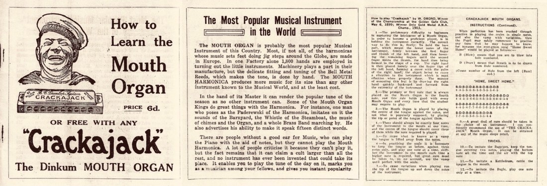 Finally I’ve been able to peek inside the Crackajack tutor booklet. A few gems were discovered from within its pages. The diamond was the Professor’s tips on playing the instrument that fits in a waistcoat pocket. Was the Professor the one they termed the Paderewski of the mouth organ? What is a Paderewski? More on the Professor and Paderewski later. Let’s have a gander.