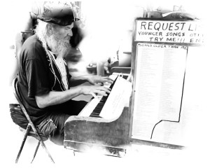 On another visit to the metropolis to watch the footy at the ‘G’ (MCG – Melbourne Cricket Ground) we arrived early (parking by the boatsheds of the Yarra River) to have lunch at the Pancake Parlour (a short stack with cream & maple syrup). As we made our passage there, the sounds of a honky tonk piano filtered through the hustle and bustle of the populous. Within a few shops of our destination a piano busker of Seasick Steve appearance was tickling the ivories on an old battered, upright piano. His name, Terry Sansom. I wondered on the mechanics of manoeuvring his instrument of choice to and from the venue. If people enquired Terry would peer through the tram power lines and into the heavens above and reply, “Helicopter.” I waited to view his exit – stage left. Terry placed detachable wheels to the under carriage (holes had been drilled into a piece of redgum) and then steered the piano by handles along Bourke Street to a laneway where his van was parked. Well I never! No such effort required with the pocket harp.