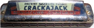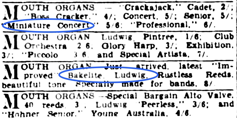 Prominent world harmonica collector Harland Crain sent HRR this photograph of a Crackajack Miniature Concert (with bakelite frame). In the Melbourne Weekly Times (Saturday 10th November 1934) advertised alongside the Crackajack Miniature Concert was Ludwigs “Improved Bakelite” mouth organ (maybe the Antoria Concert).