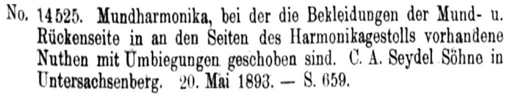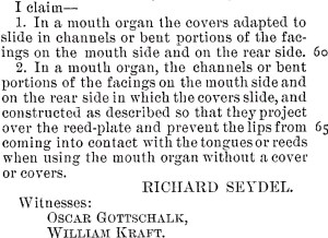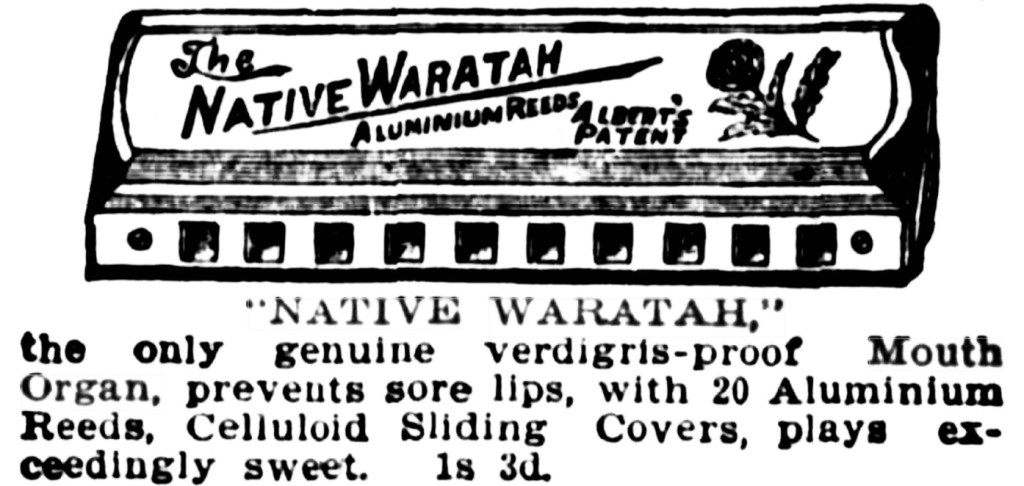 In Jordan’s advertisement from Grafton’s Clarence and Richmond Examiner on the 10th July 1894 it mentions Seyart as the patent and maker. I have a feeling this may have been a misprint as I could not find (through all my sources) anyone making mouth organs by this name. I wondered if it was Seydel (or if it had been a merger of Seydel and Albert’s name) and if the mouth organ mentioned was actually the Native Waratah made by Seydel for Albert’s. The Native Waratah had a sliding celluloid cover plate that protected the lips from poisoning. The time frame fits to a tee. I even discovered Richard Seydel’s 1893 patent for a mouth organ in which the cover plate appears identical in shape to the Native Waratah.