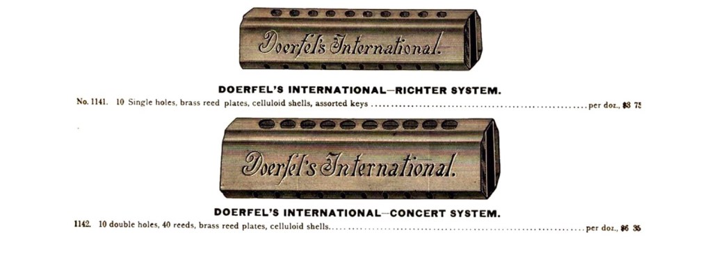 Max Doerfel’s International was one of the first mouth organs to use celluloid. These two models advertised in 1892 were patented by Max the previous year.