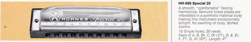 The earliest mention I could find of the Special 20 harmonica was from a 1974 US Hohner catalogue. I had believed the Special 20 was offered prior to this date for the UK market, however when a Hohner catalogue dated 1972 was scrutinised more closely there was a 1976 book by Jerry Ackley advertised. Interestingly the Special 20 is promoted as new and with more fanfare in this catalogue than the blurb in the 1974 US catalogue (pictured below). It is quite possible the Special 20 may have been available in stores earlier than 1974.