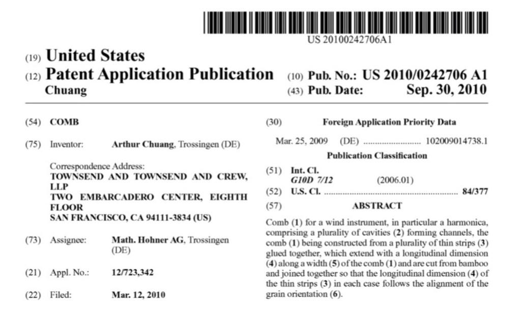 There isn’t a patent that I’m aware of – strange since it was such a revolutionary development in the construction of the harmonica. On the packaging of my recent Special 20 purchase they pronounce, “The world’s first diatonic harmonica with projecting mouthpiece and recessed plates ensures air tightness, water – resistance and playing comfort.”