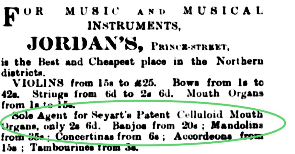On display inside Jordan’s Music Emporium were a variety of violins, mandolins, concertinas, tambourines, accordions and, featured in the mouth organ section, a Celluloid mouth organ for 2/6. Celluloid was the world’s first plastic and was designed by John Hyatt in the 1860’s as an alternative source to ivory, which was used in producing billiard balls.