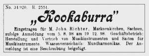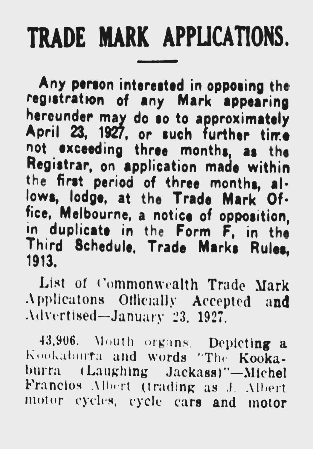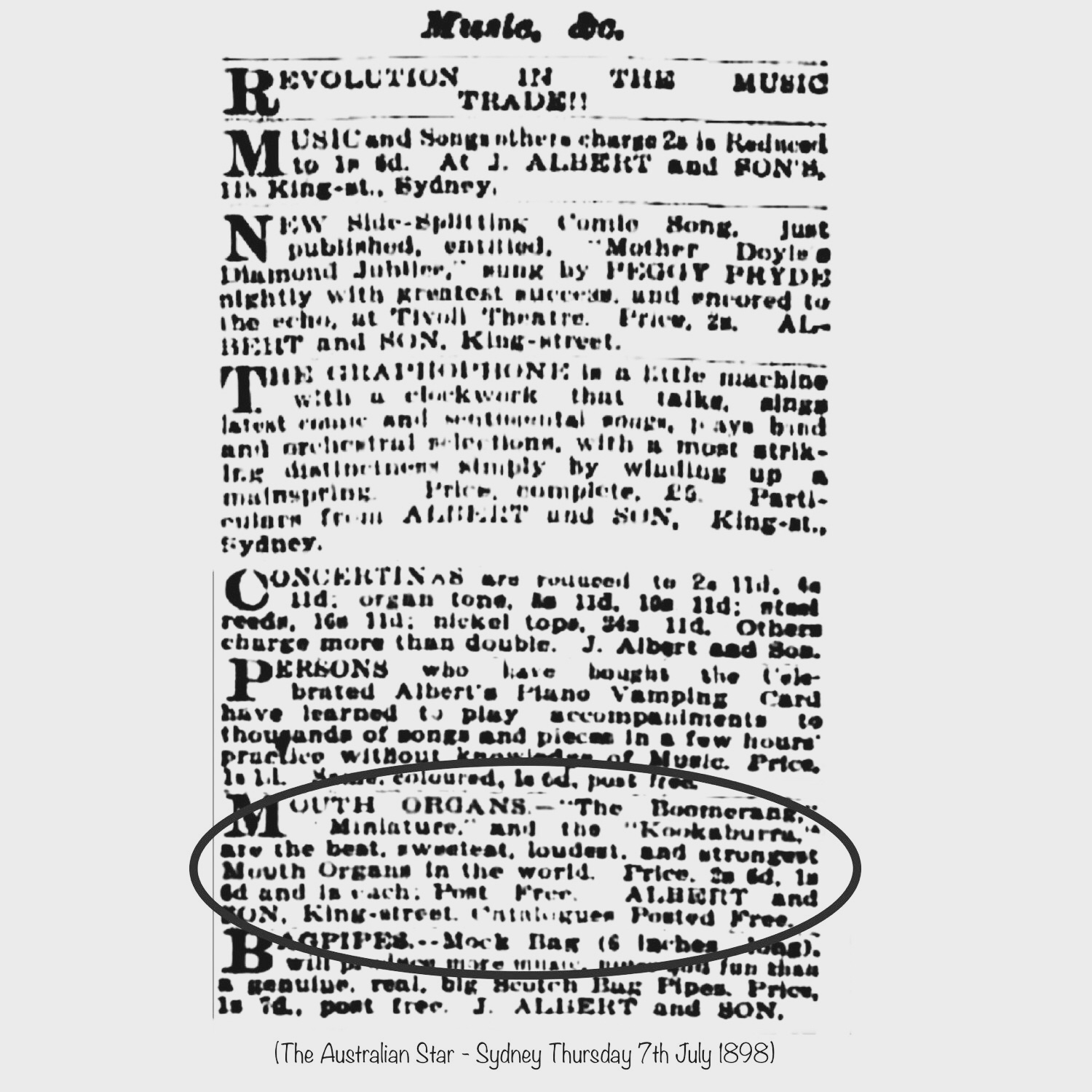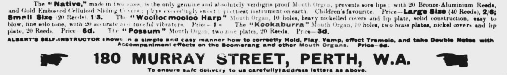 No Seydel trademark for Kookaburra could be unearthed and I presume the 1898 model is somewhat different to the 1927 Albert’s trademarked mouth organ which has the added words Laughing Jackass (Daily Commercial News and Shipping List, Sydney, Wednesday 2nd March 1927). Perhaps it was just a change to the cover plate design as the lip plate, which is promoted in the 1914 advertisement, is also seen on Doug Dawson’s physical specimen that has Laughing Jackass stamped on the cover plate.