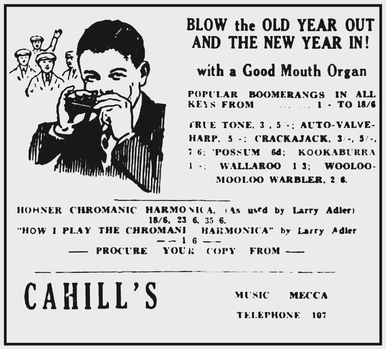 Several of J Albert and Son’s advertisements were located from 1898 that offered both The Boomerang Miniature and the Kookaburra. An advert existed in 1914 (below) for the Kookaburra and a few from the 1930’s as well. Guess what year this one from Cahill’s is? A Hohner Chromanic (say what) as used by a named gentleman might give you a clue.
