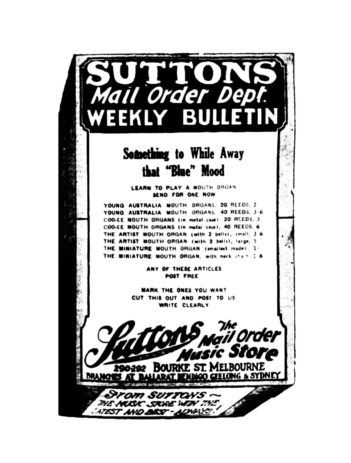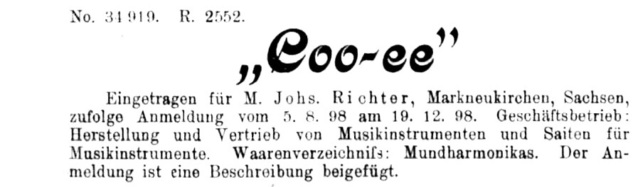 In 1898 Johs Richter trademarked both the Coo-ee and Kookaburra name for mouth organs. Seydel took over the name of Kookaburra and produced them and in 1910 they trademarked the name Coo-ee for mundharmonikas. We know one exists (just beyond coo-ee) as the owner, the editor of the Pittwater Online News, has one. It appeared in an article on Albert’s and their Boomerang mouth organs. There was no accompanying information relating to the picture of the Coo-ee mouth organ. Pittwater Online News were kind enough to give us permission to use the photo, but HRR couldn’t obtain any further information or photographs. Hunter’s On The Hill sold them alongside other Seydel mouth organs in 1900 while Sutton’s in Melbourne had them on the shelves amongst other brands, which included Hohner’s Young Australia in 1926.