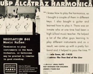 Okay, I can hear you say what does this have to do with the harmonica? Not much. Did he play the ten hole tin can? That is an unknown unknown, but I do know you can purchase an Alcatraz harmonica. A venue that Walt spent eighteen months in when it was San Francisco’s U.S. Army Disciplinary Barracks (in 1934 it became a Federal Penitentiary). The back cover plate of the Alcatraz harp has inscribed Where Music Was A Privilege. In fact one of the rocks most notorious captive’s Al Capone invoked Music Rules Regulation #46 by being an exemplary inmate and learning the banjo. He played in a prison band called the The Rock Islanders and in a letter penned to his son from Alcatraz, Capone proudly confirmed his new musical capabilities with, “First I learned a Tenor Guitar and then a Tenor Banjo, and now the Mandola, but for Solo work only.” The regulation number forty six is printed in its entirety at the end of the article.