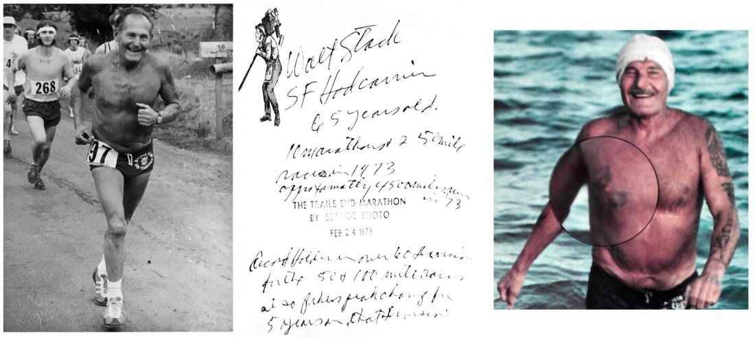 Our family wasn’t great at taking photos to relive past memories, but Walt must have given Dad this photo of him competing in The Trails End Marathon held in Oregon on the 24th February 1973. Walt signed the back and inscribed, “SF (San Francisco) Hod carrier 65 years old. 10 marathons and two 50 mile races in 1973. Approximately 4,500 miles ran in 1973. Record holder in over 60 division for the 50 and 100 mile races also……(I can’t decipher)….for 5 years in that division.”