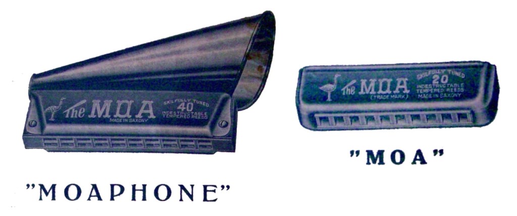 Philip (an Aussie collector), recently contacted HRR requesting info on The Moa mouth organ – a couple of models inhabit his collection. The Moa and The Kia Ora are Kiwi models that were available in the Great Southern Land. Albert & Son of Sydney offered The Moa (made by Seydel) as early as December 1899. At this point of time Australia and New Zealand were partners of the Empire and up until 1841 New Zealand was a member of the colony of New South Wales. New Zealand were invited to join the Federation of Australia, however they kindly declined, and so we went our separate ways. The Moa and Moaphone appear to be the Seydel Clover and Clover Harmonophone rebranded respectively for the Antipodes. Not sure why we couldn’t have had an Australian flavoured version of the amplification/wah wah (phone) model – perhaps an Emoo! I’ll leave it to our friends over the ditch for more extensive research.