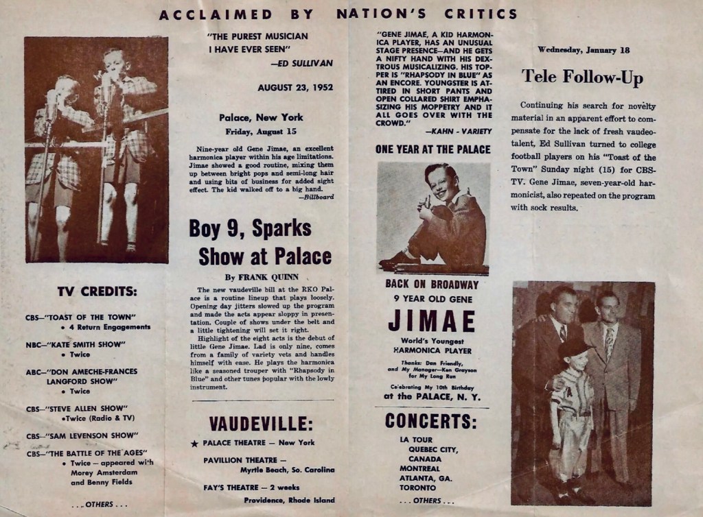 A recent acquisition to my harmonica ephemera is Aussie (and American) Gene Jimae’s program handout displaying some great illustrations and information. I had to look up ‘moppetry’ a term not frequently used in today’s vernacular. Its reference is to childhood. I have no idea of the meaning of ‘sock results’ mentioned later in the pamphlet. Can anyone help me here?