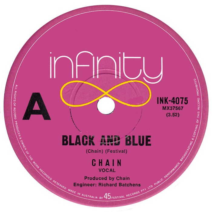 The “classic” line-up of Chain was only together for eleven months, but in this time they enjoyed a National Top Ten hit (number one on Melbourne’s radio charts) in 1971 with its debut single on the Infinity label, ‘Black And Blue’. At the end of the band’s first rehearsal, guitar guru Phil Manning was playing a riff that vocalist and harpman Matt Taylor was gob smacked by. He suggested to Phil to slow it down a wee bit and while the other band members were off having a cup of tea (or something more medicinal), he went and penned some lyrics to a work song that reflected our convict past. An hour later ‘Black And Blue’ emerged.