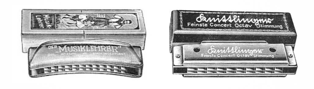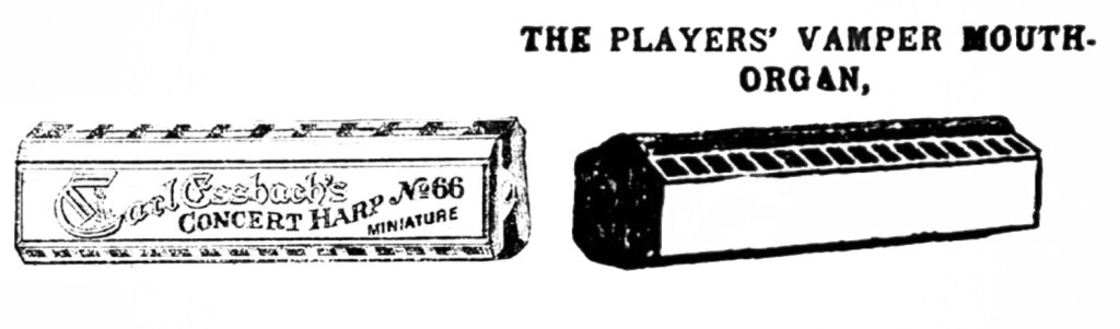 Carl Essbach (maybe no relation) had sold harps from late in the 19th Century in Oz, in particular the popular Concert Harp pictured (below left). There were quite a few Essbachs involved in the mouth organ trade a Fritz, Otto and two Reinhards. Carl’s enterprise was on quite a bigger scale when compared to Christian Albin Essbachs.