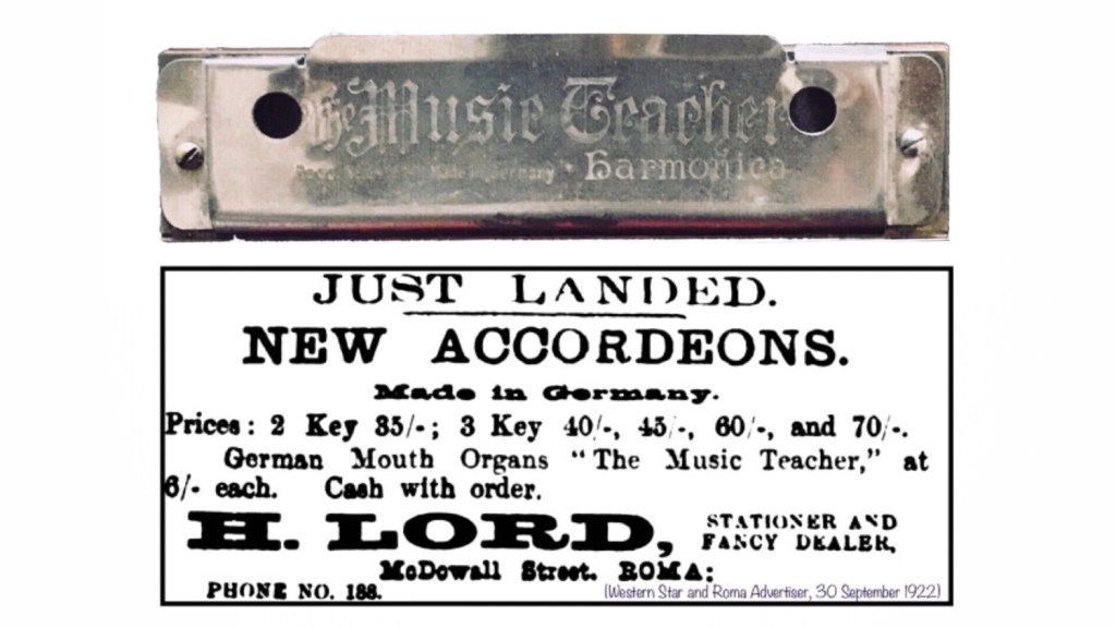 The Music Teacher has a registered #241614 stamped on the cover plate which places the harp’s origin in the vicinity of the end of WW1. I found one advertisement for H. Lord, Stationer and Fancy Dealer in Roma, Queensland, who sold the music teacher for six shillings in 1922. Fancy goods were items that were not essential, but rather for taste (fancy) – in case you were wondering.