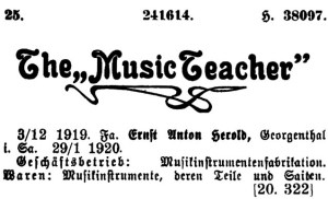 19/8/2025 Pat Missin has located the Trademark for The Music Teacher. Pat informs HRR, “There were a lot of Essbachs and Herolds in the harmonica business back in the day. In fact, I believe there were at least two different Ernst Herolds. Anyway, one Ernst Herold took over the Christian A. Essbach business and this was the company that made “The Music Teacher”.