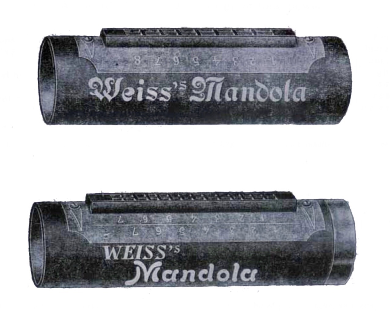 The Weiss catalogue promotes the Mandola as “besides increasing the tone, the tube gives the instrument a peculiar, most agreeable sound.” It states the tube is made of Papier-mâché. Guru Pat’s explanation on the harp’s name, “After the takeover, Hohner used the name ‘Unicum’ on a few different harps with the Weiss branding. Not sure if Weiss themselves did that. However, the ‘Mandola’ was also called ‘Unicum’.” C H Weiss trademarked the name Mandola in 1909. There are probably not many of the original Mandola’s with their original tube in existence.
