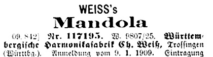 Christian Weiss founded 1850 in Trossingen. Taken over by Hohner in 1928.