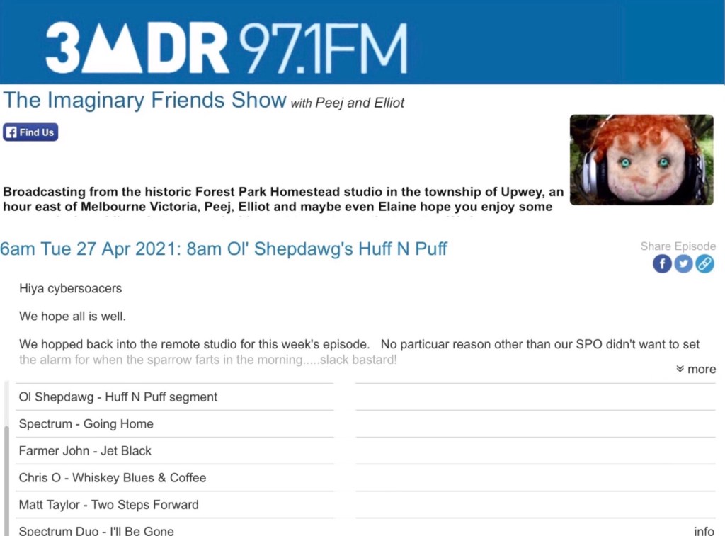Next months HRR feature will link directly to my Huff’n’Puff segment on Peej’s brekky show, The Imaginary Friends Show on local award winning community radio station 3MDR. If you haven’t listened before do yourself a service – either live or via the archives, which are kept for six months. I’m on the last Tuesday of the month from 8am to 9am. We have segments within a segment – NTRBSS (Name That Riff Before Shep Sings) and NSFSS (Now Something From Short Stop – not as far as Left Field). Here’s the link to last month’s show TIFS. Tune in next Tuesday to find out more about the article. Hear me play live and maybe if Peej doesn’t guess correctly hear me sing (hope he gets it right).
