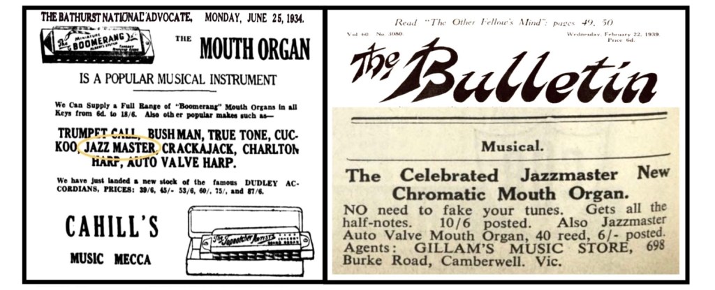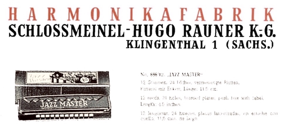The manufacturer of the Jazz Master mouth organ was unknown to world collectors until now. When searching through a Schlossmeinel – Hugo Rauner catalogue, there was a tremolo Jazz Master model advertised. Woo hoo! The catalogue has been dated to 1945. This was an almagamation of two companies C H Meinel, one of the oldest companies founded in 1850, and a younger company established circa 1930’s. The earliest advertisement for the Jazz Master I could find was in 1934 by Cahill’s of Bathurst NSW.