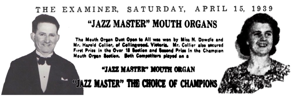 The Jazz Master model became popular here for a time on the back of prominent Australian player’s endorsement. Australian champion mouth organists Harold Collier (photo courtesy of Ray Grieve) and Nellie Dowdle were performing with them in 1939 after having previously been associated with F A Rauner’s Crackajack harps. Laurie Smith, renowned Chromatic player, had at one time associated his name with the Jazz Master. I wonder if this was a chromatic Jazz Master? More on Laurie to come.