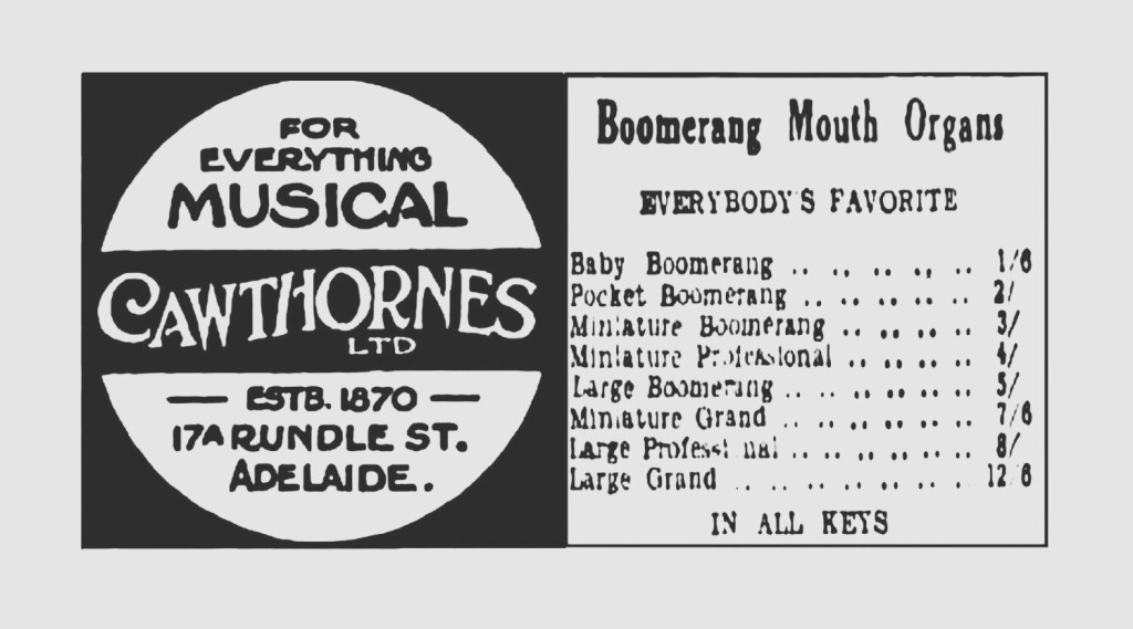 Just a bit of housekeeping. A photo of Sutton’s of Ballarat from 1902 added to Trump The Mouth Organ. Also an interesting photograph of a Boomerang De Luxe at the Klingenthal Museum courtesy of Mark Weber affixed to My Boomerang Did Come Back.