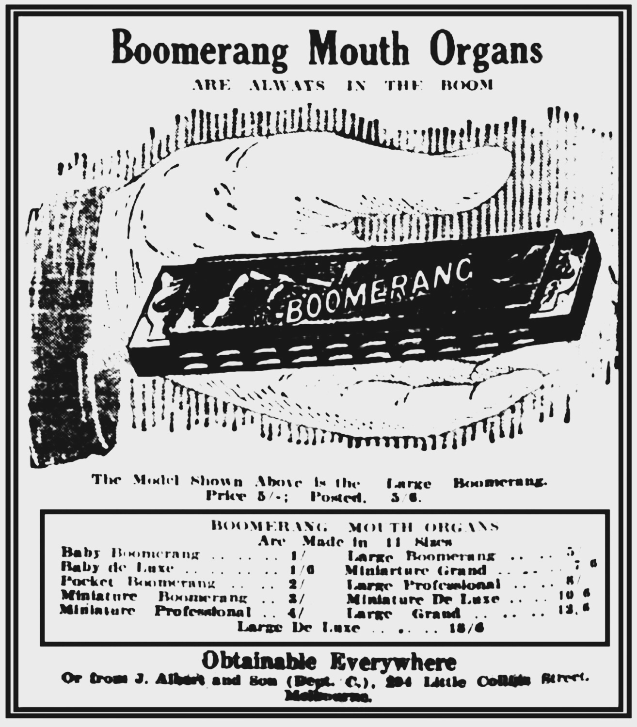 The boomerang shaped mouth organs were sold under the banner of De Luxe. Here’s a sketch of the Baby. At some stage there was even a Little Boomerang. I’m lookin’!