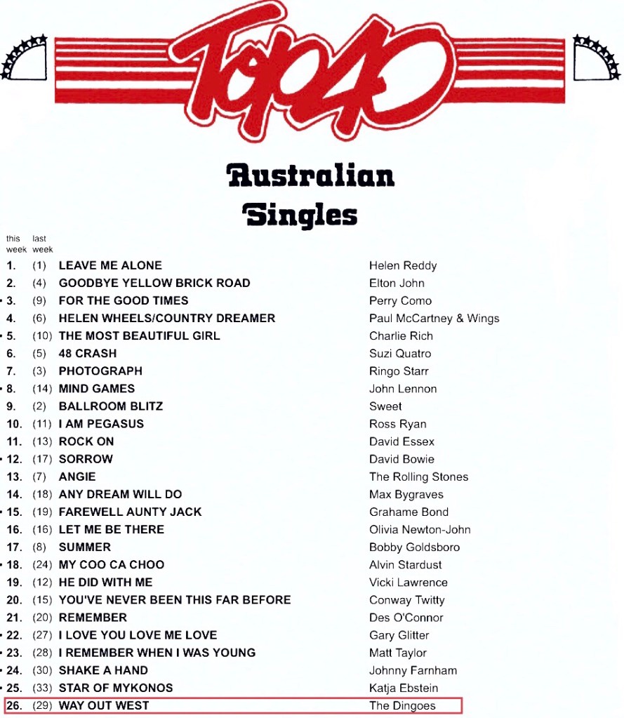 The Dingoes’ original debuted at twenty nine on the Go Set National Charts on Australia Day 1974. It only climbed to twenty six the following week before exiting the next. Locally, in Melbourne, Way Out West had entered the 3XY charts in late November the previous year and peaked at number thirty. It remained in the Top 40 for eight weeks before dropping out in mid January. Why is it so?