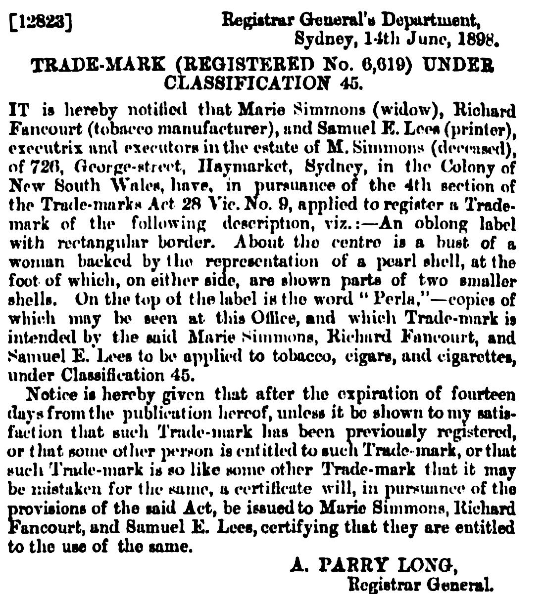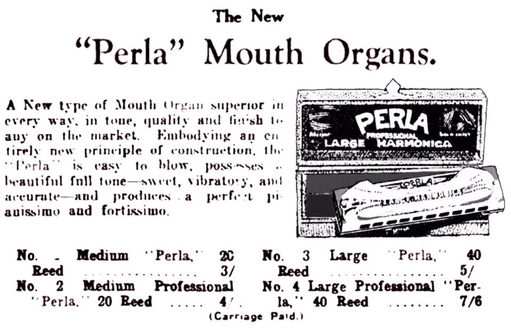 The word Perla and accompanying label was trademarked in 1898. Mick’s widow and sons had taken over the reins of the business and began selling their own brand of Cigars called Perla. Perla is Spanish for Pearl. It had been mooted that the Perla mouth organ was named from the Aussie colloquial word ‘pearler’, but this didn’t originate until the 1940’s as a term for a really good delivery by a bowler in cricket.