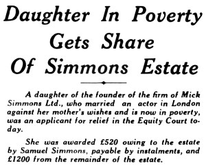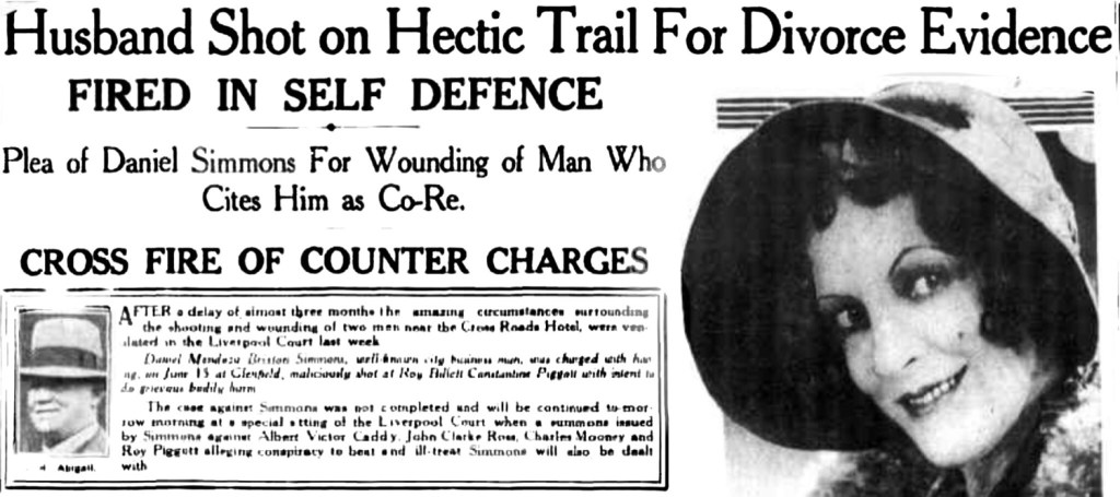 Daniel Mendoza Brixton Simmons, the youngest of Michael’s tribe, was born in Brixton – hence the middle name. He was a director of the company in 1910, but he wasn’t in 1934 (maybe even earlier). Fond of the fillies, and not just the racehorse kind, he was married twice before having a clandestine affair with Mrs Cecilia Piggot (pictured below), who would later walk down the aisle as his third wife. Before the grand event, Bricky (Daniel) had been arrested for shooting and wounding two men near the Cross Roads Hotel in Liverpool, Sydney. One was the husband of Mrs Piggot. He must have had a good lawyer as he was found not guilty on the basis of self defence! Bricky didn’t get off scott free as he had to pay £2000 in damages when found guilty in the Divorce Court of stealing Ray Piggot’s wife. During the proceedings Daniel told the court he was a man of little means and was paid £5 6s 3d a week as a traveller for Mick Simmons Ltd.