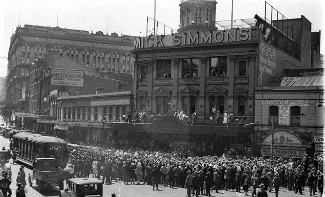 This photograph of Mick Simmons’ store in 1930 was touted as, “huge crowds attending the demolition sales.” However, I have seen it purported that they were there to see Don Bradman on the balcony. This would make some sense. The Don had just returned from a triumphant Ashes tour of England and had been in the employ of Mick Simmons since 1929. Many prominent sportsman were employed by Mick Simmons Ltd and this was a significant factor in the popularity of the store. Cricketers, Stan McCabe and Archie Jackson were at one time in their employ. Facilities available on the rooftop in 1935 included golf nets, a putting green and a tennis court, where patrons could receive tuition from the experts. Inside was furbished with a billiard hall, a rifle range, indoor cricket nets and a theatrette used extensively for lectures.
