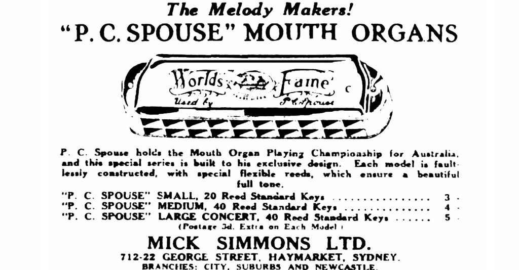 R M Simmons (Raphael Mendoza) was known to many as simply Ray (probably sounding more Aussie – a bit like his father before him). Ray headed the business as Managing Director and it was on his watch that the highly prized Perla Mouth Organ hit the stores in 1927. I’ve sought higher authorities to find the maker and one highly prominent world collector believes it could be Johann Schunk because the fluted cover is similar to the Miss America harp (sold in the States at about the same time). Perhaps? I’m not convinced as the Perla’s fluting appears to be continuous, unlike the Miss America. It’s interesting that the Chromatigrand, sold by Mick Simmons in the late thirties, was by Johann Schunk. They also moved Albert’s Boomerang mouth organ range within their stores at this time. I’m so sorry to say I couldn’t locate a physical specimen of the Perla. If you have one just give us a hoy.