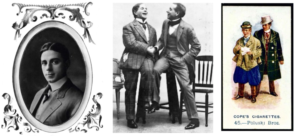 The brothers were a famous music hall double act, whose routines were used by many of the famous double acts that came after them. Sam was the straight man. One of their classic patters, ‘He Can’t Do It’ involved Will Poluski asking Sam questions and then he’d hop around the stage shouting the phrase. Will had another act where he would wrestle himself, which Monty Python (and others) would use years later. Sam also appeared solo in several short silent films, such as: ‘Nosey Parker’, ‘Oh that Woollen Undervest!’, ‘Nobby the Knut’, ‘Nobby the new Waiter’ and ‘Nobby and the Pearl Mystery’. In 1919 Sam would also have his own financial worries when he failed to repay several sizeable debts. He stated, “his financial difficulties were due to the extravagance of his ex-wife, who had £5 per week out of his earnings, which averaged about £500 a year.” He went on to imply the majority of his debts were; money borrowed from his brother (£300) (to repay debts incurred by his wife) and £268 to a motor car company that was also a result of his wife’s indulgence. No mention of his children!