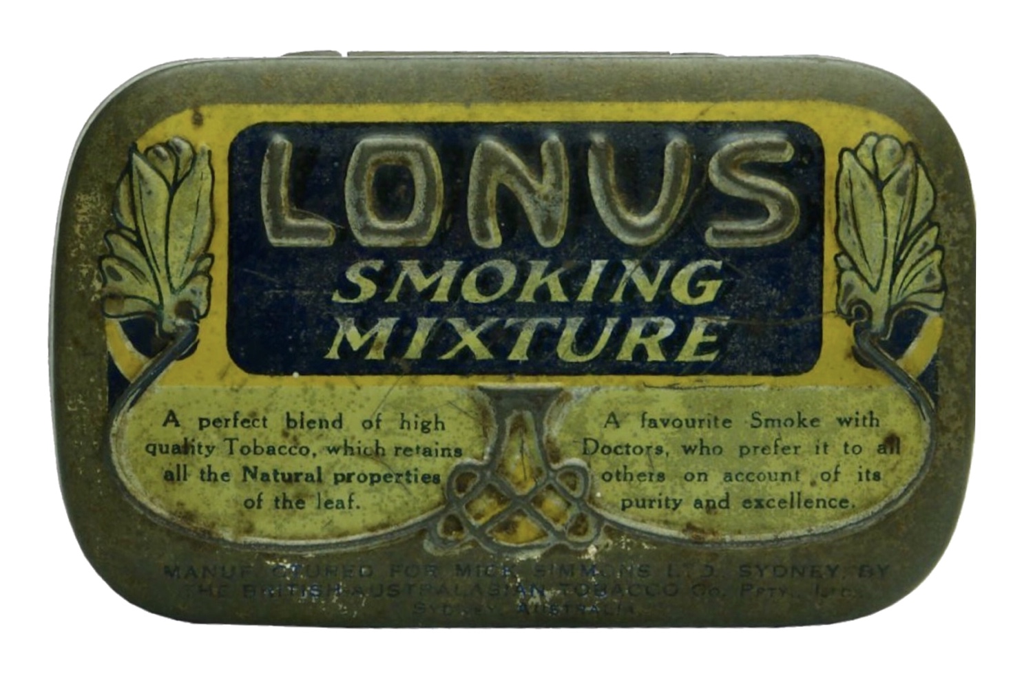 A prominent tobacco item on display in 1909 was a new smoking mixture called Lonus, which was highly recommended by doctors. Say what! The tin opposite bears the print ‘manufactured for Mick Simmons’.