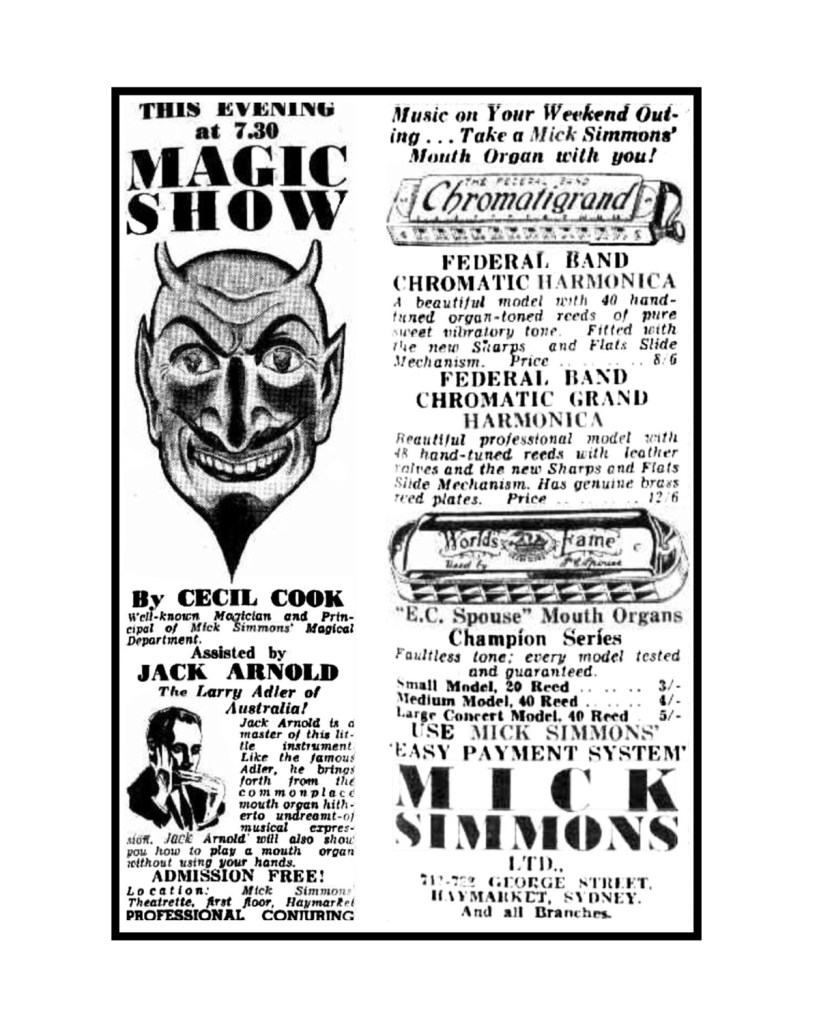 Jack Arnold, in the Mick Simmons’ advertisement above (just his graphic was used in other adds with no reference to his name) was a Tivoli performer and a member of George Sorlie’s Revue Company. He was also a highly sought after performer for sporting and community socials. A singer, guitarist and harmonica player, Jack played a fine rendition of Smoke Gets In Your Eyes while smoking two cigarettes, playing the guitar and harmonica and whistling all at the same time. Now that would have been something to behold! Other tunes in his repertoire included: Tiger Rag, Boots and Saddles, Lazybones and South American Joe and, a comedy song that would always bring the house down, Underneath the Bed. There were many chromatic harmonica exponents in Australia promoted as our Nations Larry Adler. I’m not sure that all were in the same calibre as Larry. And with no disrespect to Jack, as I never heard him play, the label champion is often used indiscriminately.