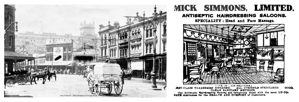 The business flourished and, at some pointed time, a new store was purchased a few hundred yards away in Sussex Street. This operated both as a factory and an outlet. Hairdressing was added to the services of Mick Simmons and the sale of sporting goods – with a particular emphasis on Cricket, Fishing and Hunting. In 1889 his son Raphael was appointed a director of the firm. Sadly in 1894 Mick passed away at the young age of forty two. He had complained earlier in the week of mild abdominal pain and had managed to keep working. On the Friday afternoon he attended the Sydney Cricket Ground for a test match between Australia and England when severe abdominal pain hit. He was diagnosed with peritonitis and immediately operated on. He didn’t recover, passing late on the Sunday.