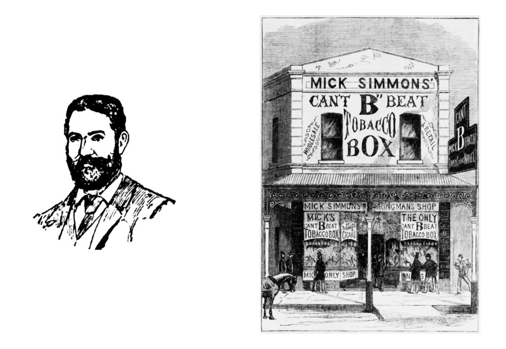 Michael Simmons disembarked the Cambodia in 1854 with his family as a two year old, having sailed from the Mother Country the year before. When just twenty-one he rented a boutique (twelve square feet) premise at the junction of George and Campbell Streets in Sydney. With a borrowed five pound note he established a tobacco business. The ‘Tobacco Box’ as it was known, specialised in all things tobacco (including their own brand ‘Can’t B Beat’).