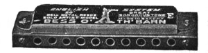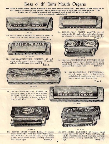Interestingly they incorrectly (or perhaps for some other reason) spelt Bess (instead of Besses) and they also managed to do this with their Rozella model (at least they were consistent) which was sold here as well. I wonder if it had anything to do with Rosella an Australian company established in 1895 famous for their canned tomato soup. Both mouth organs have stamped on their cover plates English System. This appears on their Blue Bird harps that they manufactured for the British market. Bohm were a major player there up until World War II. They ran a national harmonica club and would also organise regular contests. This may be a reason why the Besses mouth organ wasn’t sold there. Probably not a grand idea to compete against your own heavily promoted and popular model. Even rival mouth organ brands were capitalising on the Besses o’ th’ Barn’s tour.