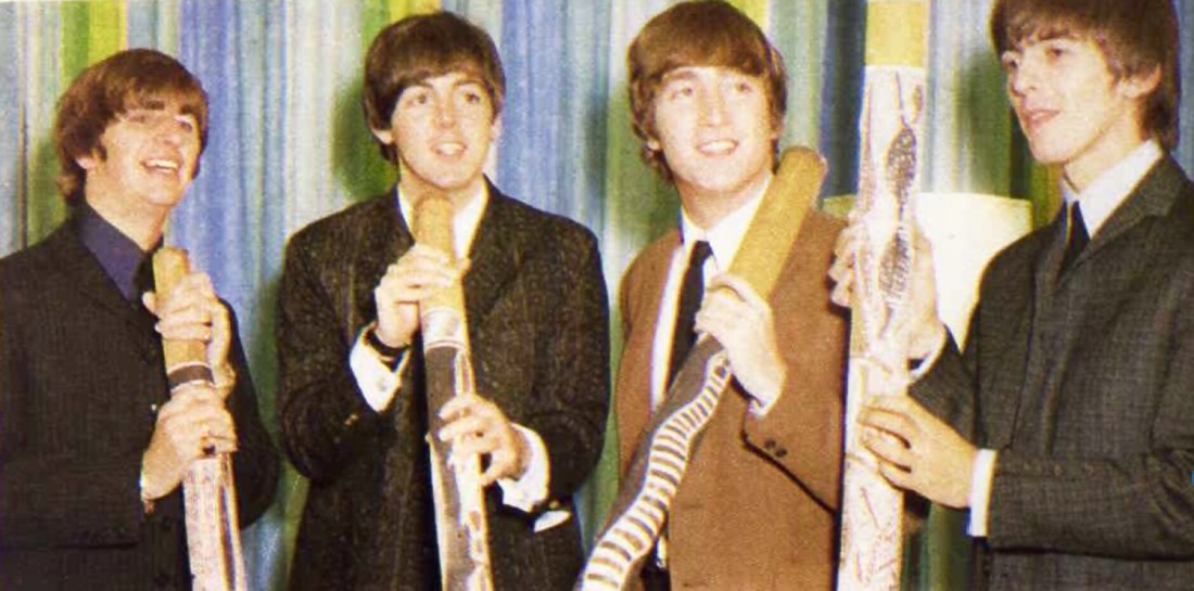 The Besses tour was a marketable commodity Down Under and F A Bohm manufactured a Bess o’ th’ Barn mouth organ to cash in. A brass band in the pocket! Hohner produced a Beatles harmonica some fifty years or so later when they were at the peak of their powers. It was really only the graphics on the box as nothing was distinctively marked on the cover plates. There was a wee mistake with the signatures not lining up with the caricatures of Paul and George. Pictured below, the boys Down Under, with their gifts – didgeridoos. Don’t think the didge’s appeared on an album.