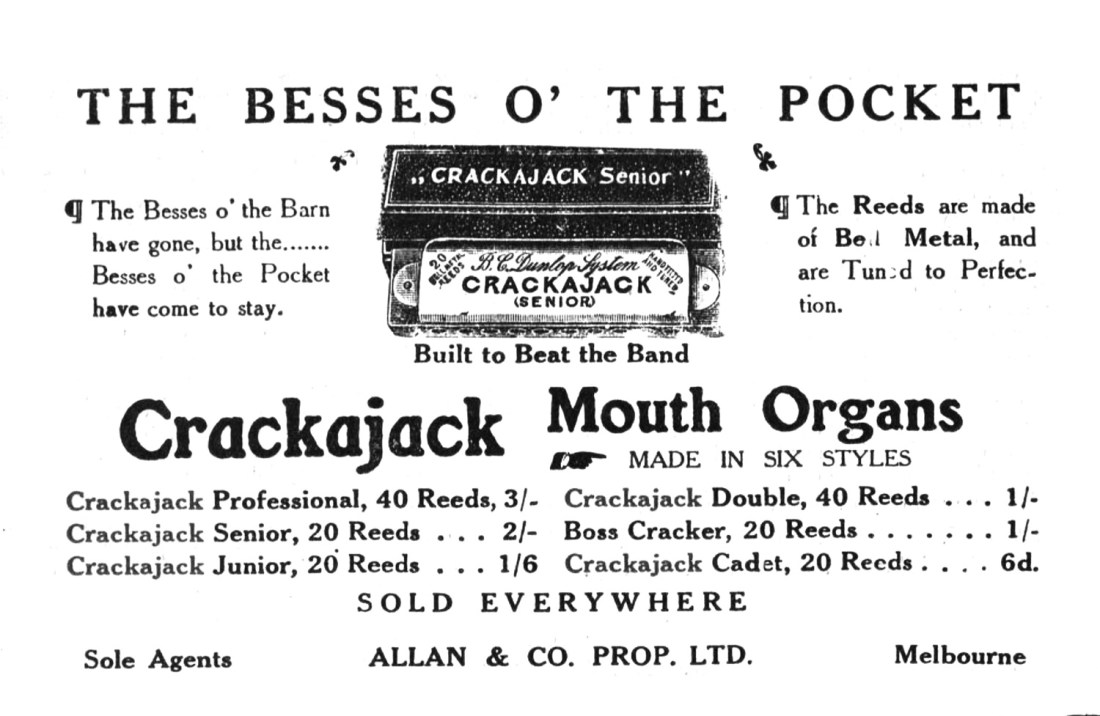 Interestingly they incorrectly (or perhaps for some other reason) spelt Bess (instead of Besses) and they also managed to do this with their Rozella model (at least they were consistent) which was sold here as well. I wonder if it had anything to do with Rosella an Australian company established in 1895 famous for their canned tomato soup. Both mouth organs have stamped on their cover plates English System. This appears on their Blue Bird harps that they manufactured for the British market. Bohm were a major player there up until World War II. They ran a national harmonica club and would also organise regular contests. This may be a reason why the Besses mouth organ wasn’t sold there. Probably not a grand idea to compete against your own heavily promoted and popular model. Even rival mouth organ brands were capitalising on the Besses o’ th’ Barn’s tour.