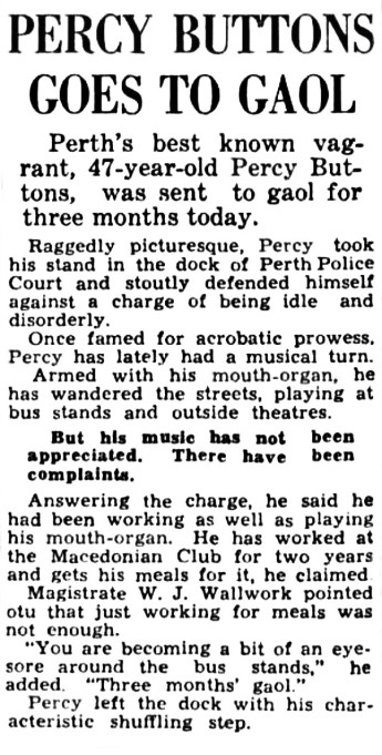 From time to time he had run-ins with the local constabulary, who were not as enamoured as the general public with his antics. Twice in 1933 he found himself at the authorities displeasure. Police Constable Handcock stated at the hearing that Percy was, “in the habit of gathering small boys about him, showing them his tricks and how to get out of hand cuffs.” In the magistrate summation he remarked, “I said all I have to say last time. You are a problem. Button. You are not normal. I’m satisfied of that. Yet, you do not seem to be a fit subject for any of our institutions. You are not an edifying sight; you may amuse a certain class of people, but to the majority you’re so offensive that they have to hasten to get away from you. If you are sick I’m going to send you to a place where you will get proper medical attention — one months hard labor.” ( Perth Mirror Saturday 18th February 1933) Then in 1940 he was off again.