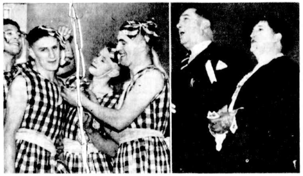 Herald Get Together 1935 – Members of Northcote Footballer’s Ballet (left) and Carlton President David Crone and wife singing a duet.