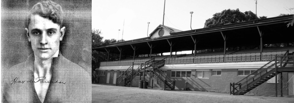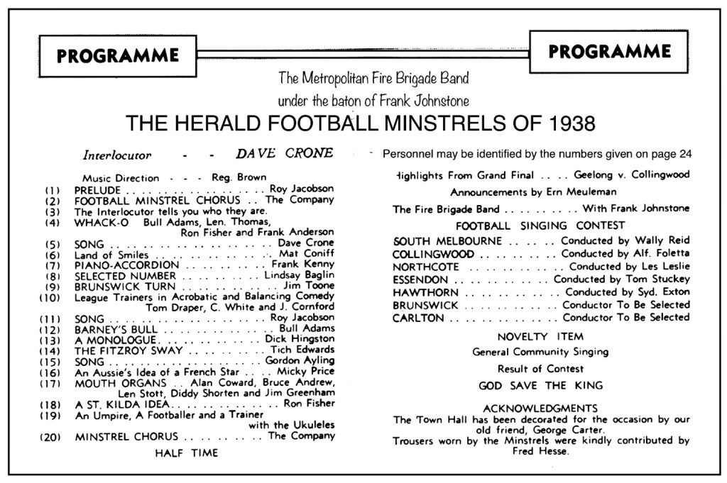 Fitzroy centreman Len Stott was not only adept with a football in hand, but he was also no slouch with the mouth organ in his dukes. He performed in a mouth organ quintet on the 1937 show. On the program of 1938 (below), he backed up again performing a novel mouth organ composition along with the same crew except for the substitution of Ben Collier (Geelong Trainer) for umpire Allan Coward. In 1937 Fitzroy was involved for the first time and maybe the only time in the community singing. Triple Brownlow medalist Haydn Bunton was the conductor for the Fitzroy contingent and regular rehearsals were held under the grandstand (my home away from home see Winger Griffiths). Bruce Andrew reportedly was also noted for his abilities playing the bones. In the second production of 1937, Brownlow medallist, Essendon’s Dick Reynolds, was interviewed by comedian and radio personality Charlie Vaude. Charlie provided training for the players in in the minstrels section of the program.