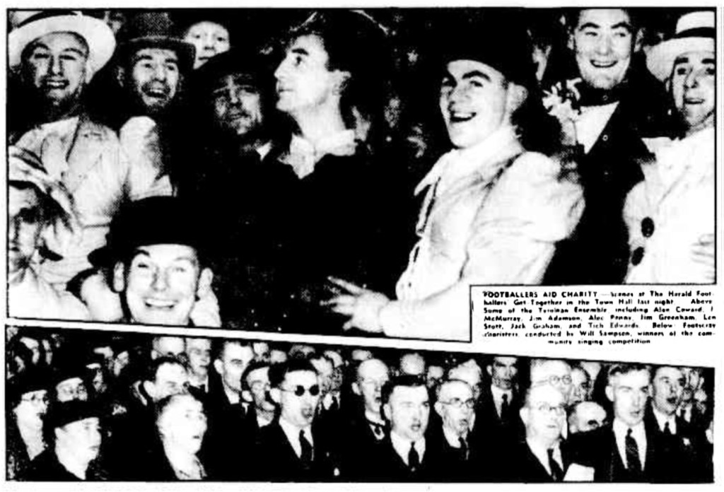 Footscray were crowned inaugural winners of the community singing contest. Northcote Football Club was represented with a ballet production titled ‘This Little Piggy Went To Market’ and Carlton President David Crone sang a duet with his wife. Indigenous Fitzroy champion Doug Nichols produced a stunning viola effect on the gum leaf in his rendition of Little Old Church In The Valley. There was a second Get Together held that year at the end of the season to allow those who couldn’t attend the first – due to the event being so quickly booked out. Two events per year would be repeated in subsequent years, except in 1940.